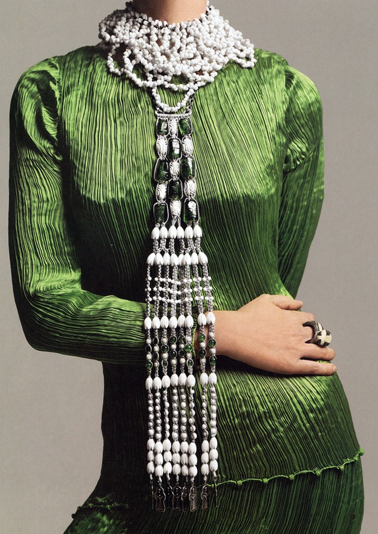 The late Tina Chow in one of her many Fortuny dresses, photographed by Antonio Lopez – 1977
