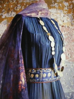 In the Belgian artist Elisabeth de Borchgrave‘s book “Paper Illusions“, by Rene and Barbara Stoeltie, she painstakingly recreates the pleated dresses, belts and scarfs in paper:
