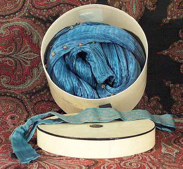 The simplicity and timeless quality of the finely pleated silk have made these dresses enduringly modern. A simple shift, with little or no adornment, it came with a silk stenciled ribbon belt. Because of the fabric and the dyes the “Tea Gowns” were rolled and sold in beautiful custom made boxes.