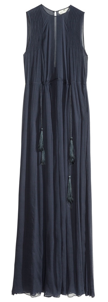 It is hard to find a “knock off” Fortuny gown, but this one below you could adorn with a large silk ribbon belt to create the “Delphos” look: