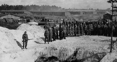 Wide shot of civilians, along with former camp staff, stand along a mass grave – April 25, 1945 – photograph courtesy of the Imperial war Museum