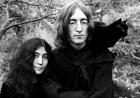 Yoko Ono and John Lennon with cat – photograph by Ethan Russell